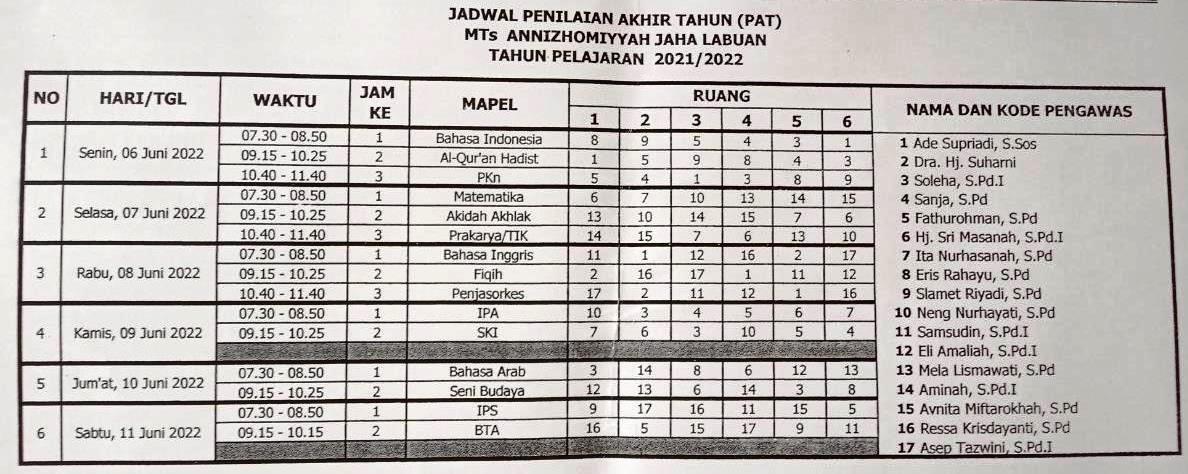Jaha (MTs) – Menjalani hari Pertama Penilaian Akhir Tahun (PAT) tahun Pelajaran 2021/2022, Kepala Madrasah Tsanawiyah Annizhomiyyah Jaha Labuan Pandeglang Rian Syofianti, S.Pd.I menghimbau seluruh siswa agar mengikuti dengan sungguh-sungguh.