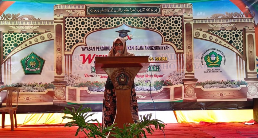 Sambutan berikutnya disampaikan oleh Ibu Hj. Een Masdariah, M.Pd selaku pengawas pendidikan kementerian Agama Kabupaten Pandeglang. Menurut beliau, tidak pas jika dikatakan belajar di Annizhomiyyah 3 tahun itu sudah lama. Pendidikan harus terus diutamakan, selamanya, bagaimana bisa terus menuntut ilmu agar menjadi orang-orang yang sempurna, di mata masyarakat, lebih-lebih di mata Allah.